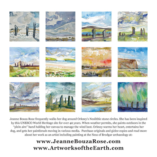 Orkney's standing stones are a major attraction and a great source of my inspiration for paintings. I like to vary the way I express my view of these standing stones and so I alternate my choice of materials. Thanks to popular demand, I have mixed months with watercolours and oil paintings. I would love to know your thoughts about the 2025 calendar. I have been painting these stones for over 40 years and every painting is different!