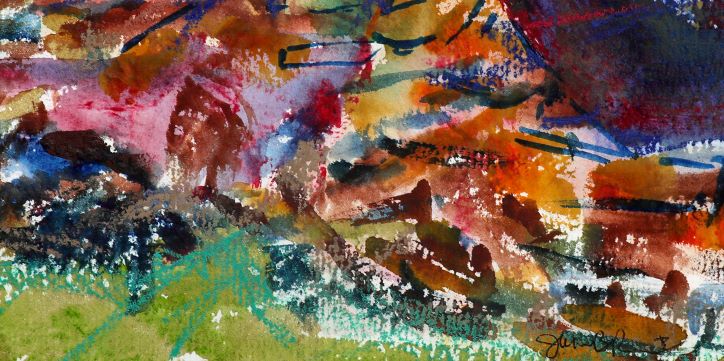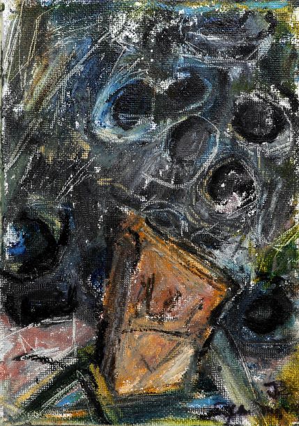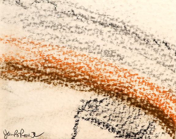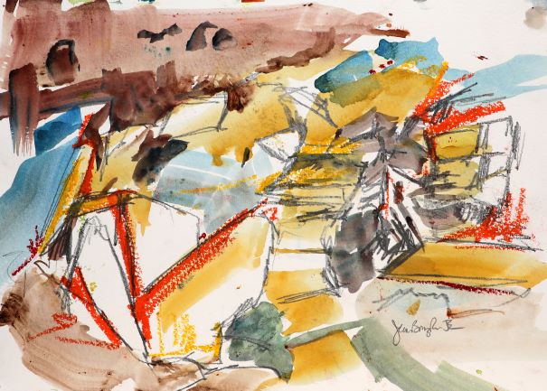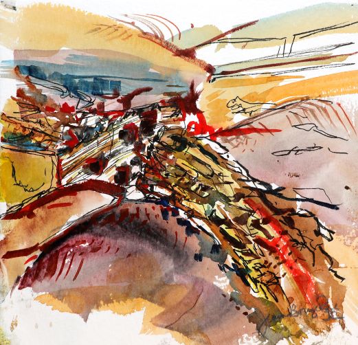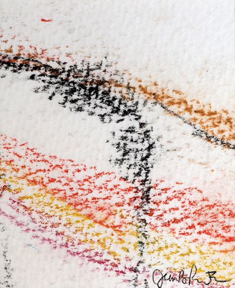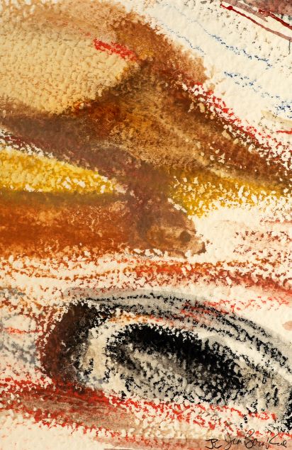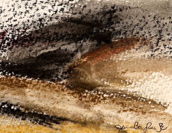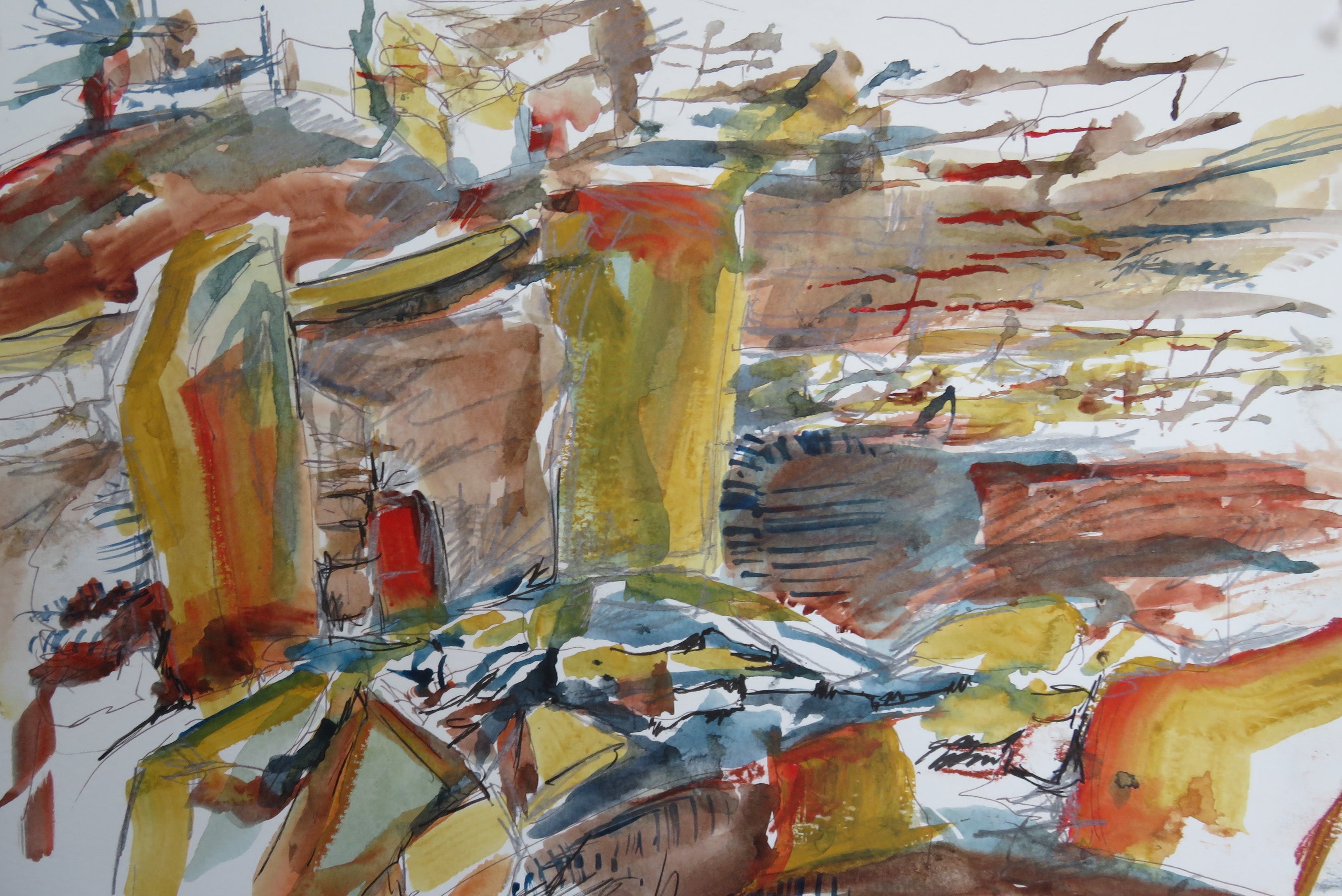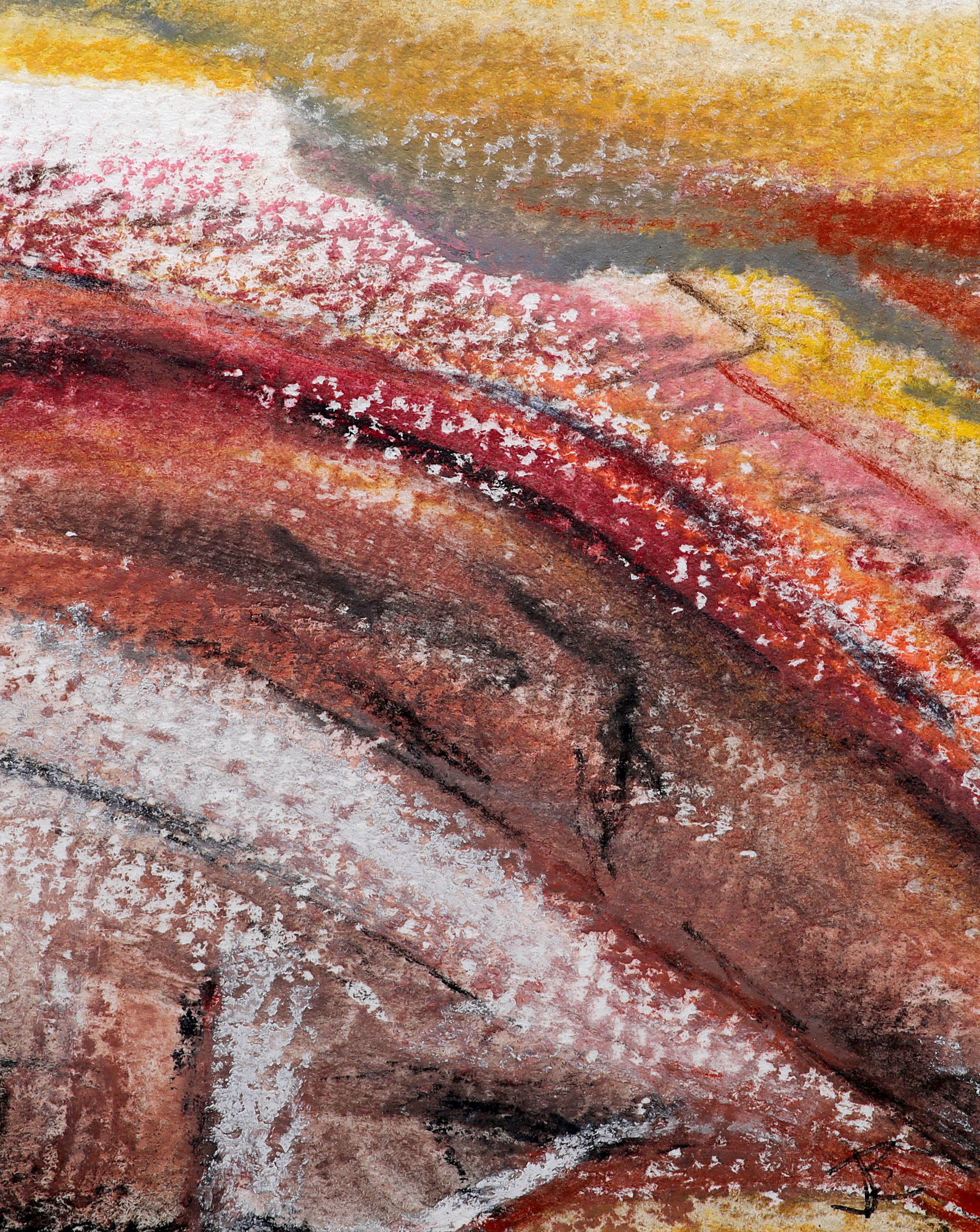 I like to integrate the use of stones when I paint as well as to add some of the earth around me. This small work has marks made by a stone found on the site. I have also used charcoal and oil pastels to add a greater sense of the site's textures.