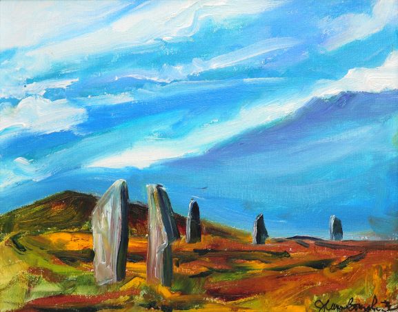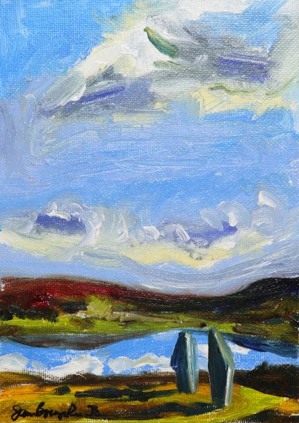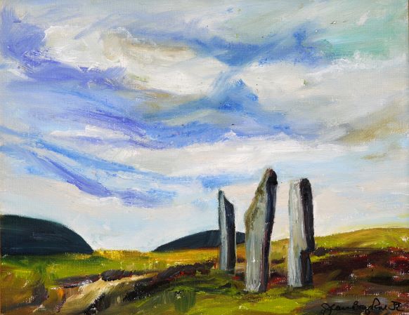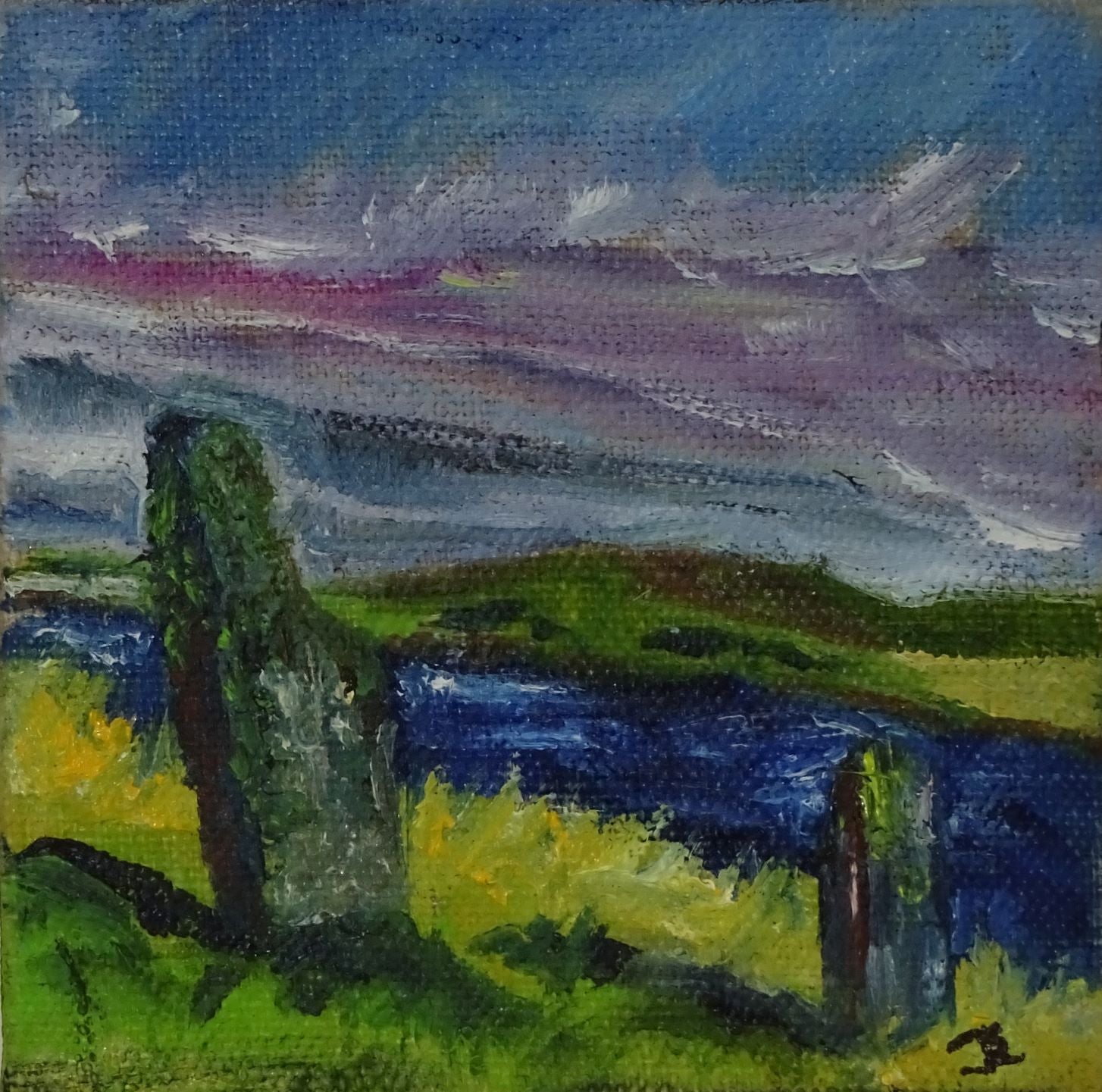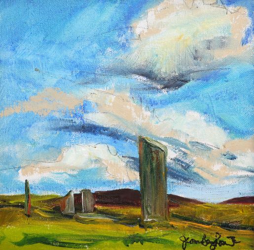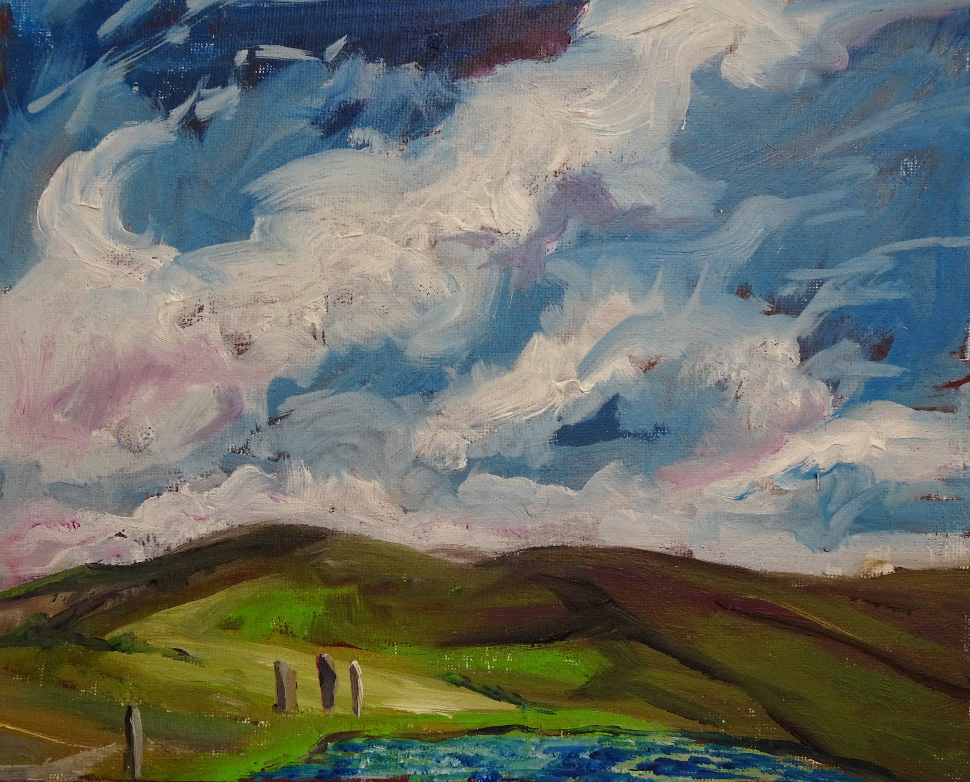 This is another of those paintings made after hours at the Ness. Another blue sky drew me to stop and paint outside the fences at Stenness. I love finding the angle where 3 stones appear to be 2.