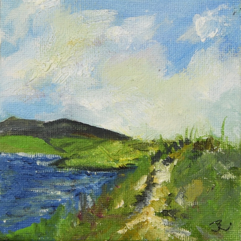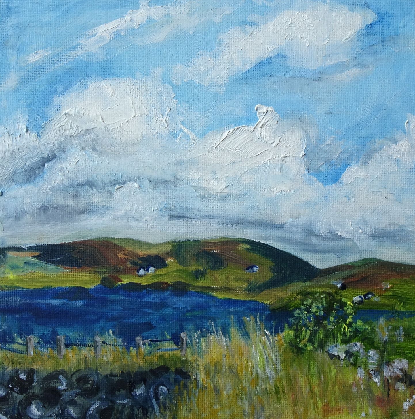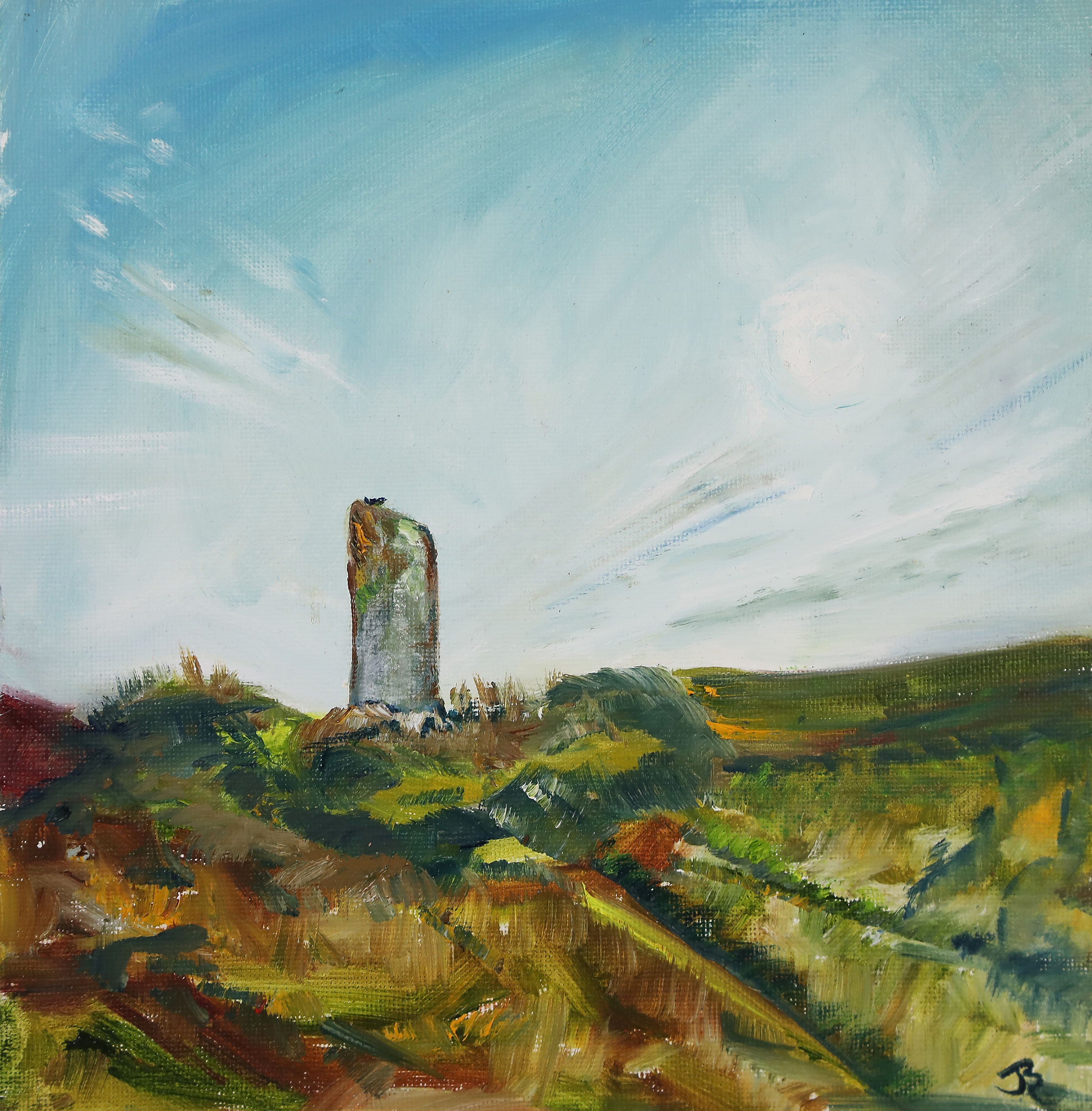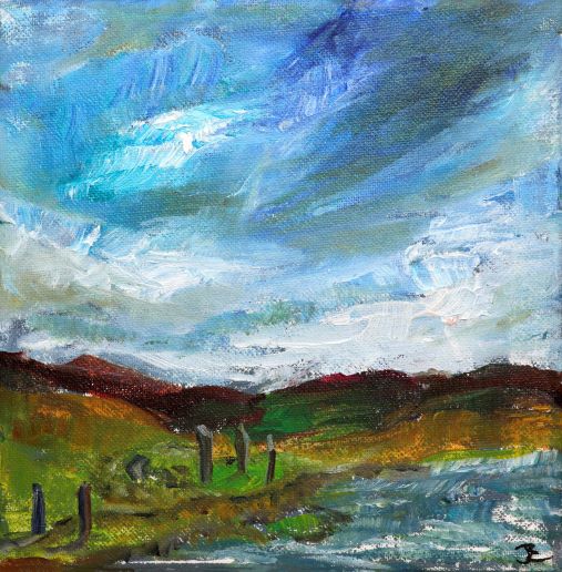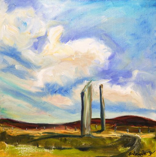 This is another of those paintings made after hours at the Ness. Another blue sky drew me to stop and paint outside the fences at Stenness. I love finding the angle where 3 stones appear to be 2.