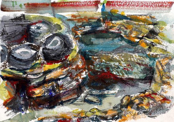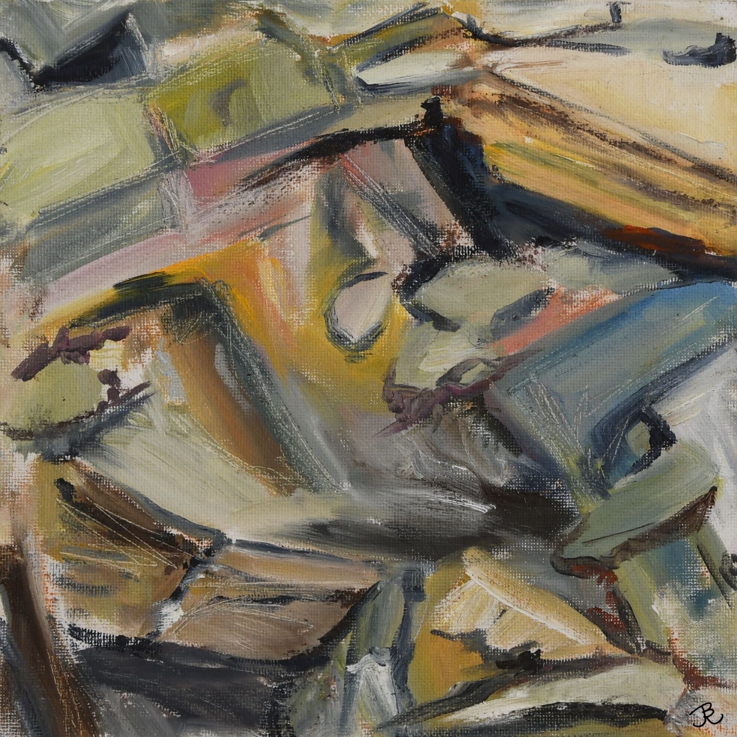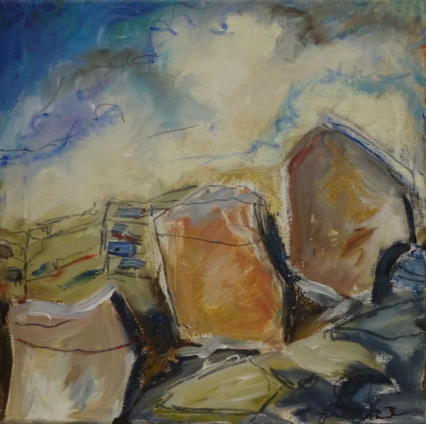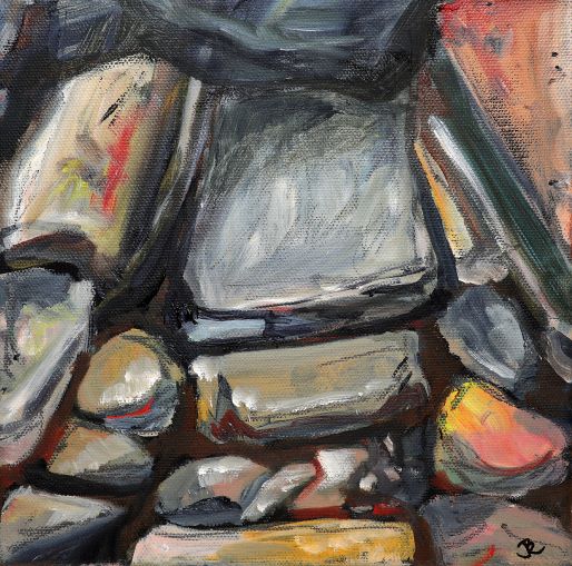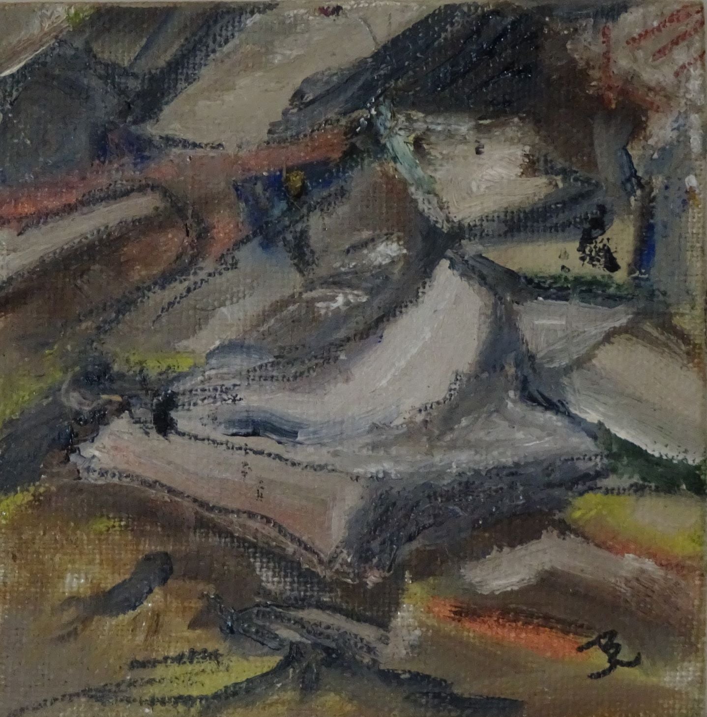 Using a small canvas, helps me to focus on a small part of the stones below me in the trench. This one, central to the rest, had a delightful curve.