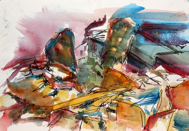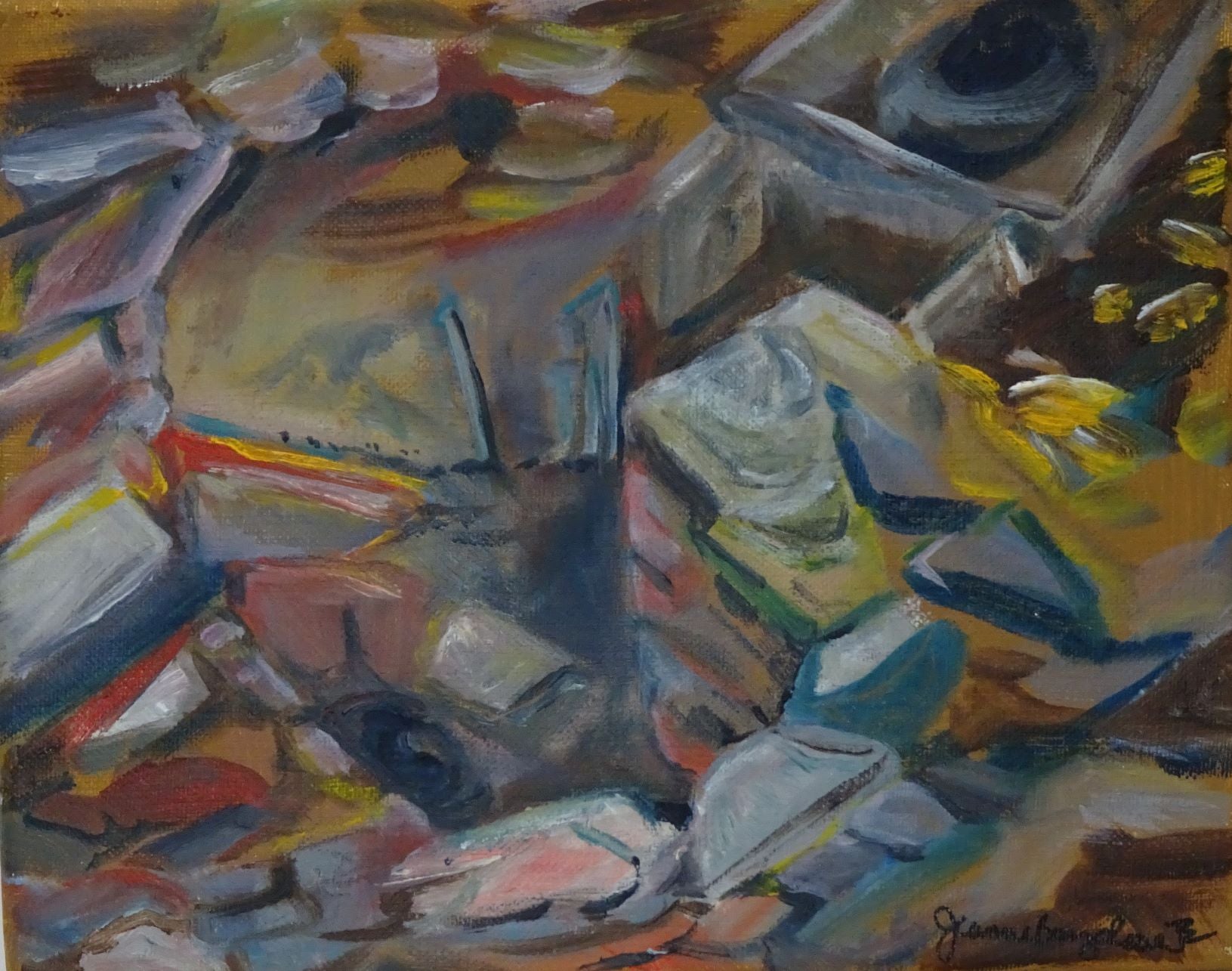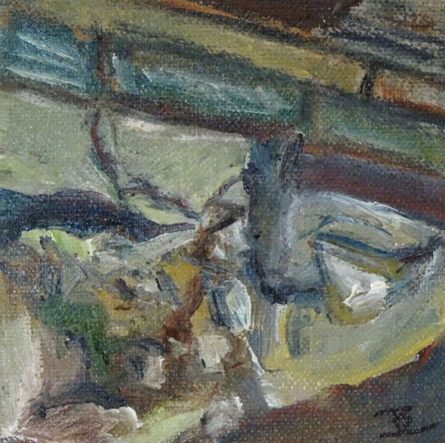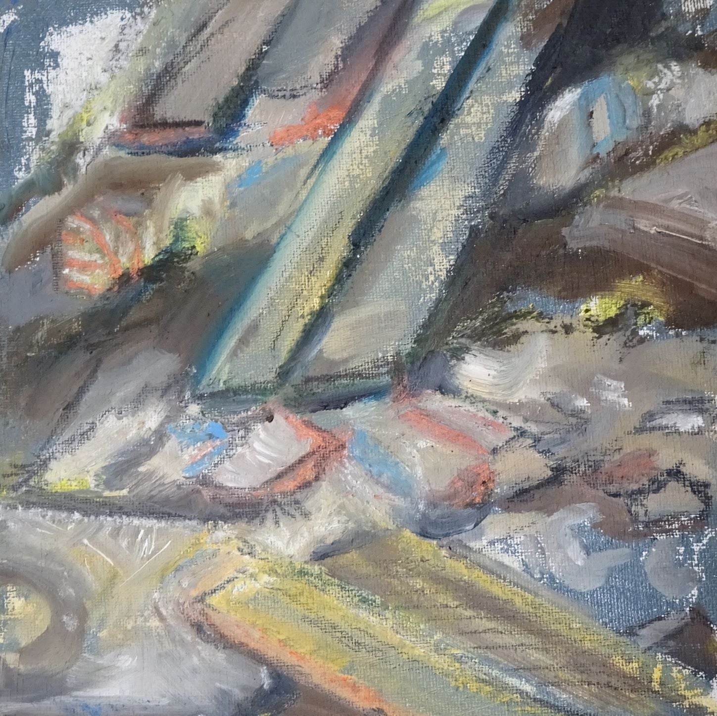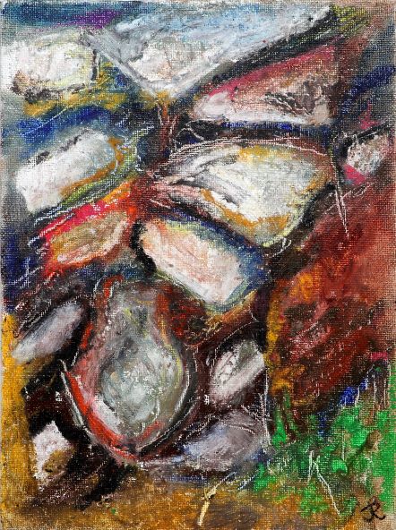 Using a small canvas, helps me to focus on a small part of the stones below me in the trench. This one, central to the rest, had a delightful curve.