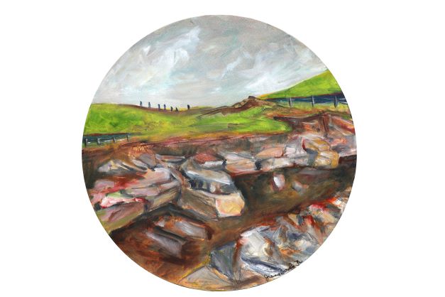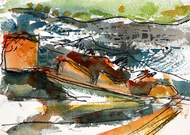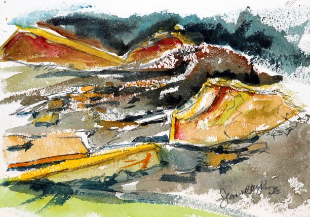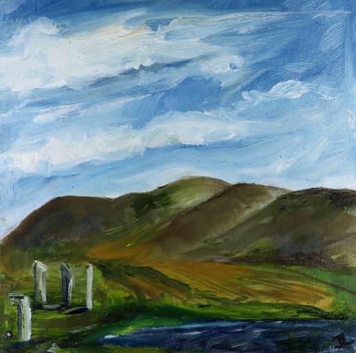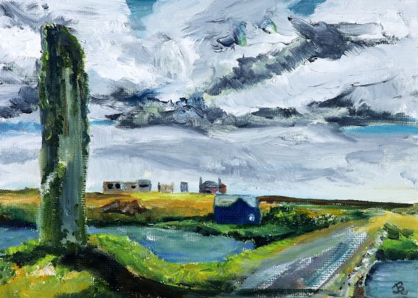 When the wind blew and I was perched at the edge of Trench T, the Stones of Stenness just looked so clear. I painted them without a roadway in front. "How lucky I am to be sitting here with a paintbrush in my hand."