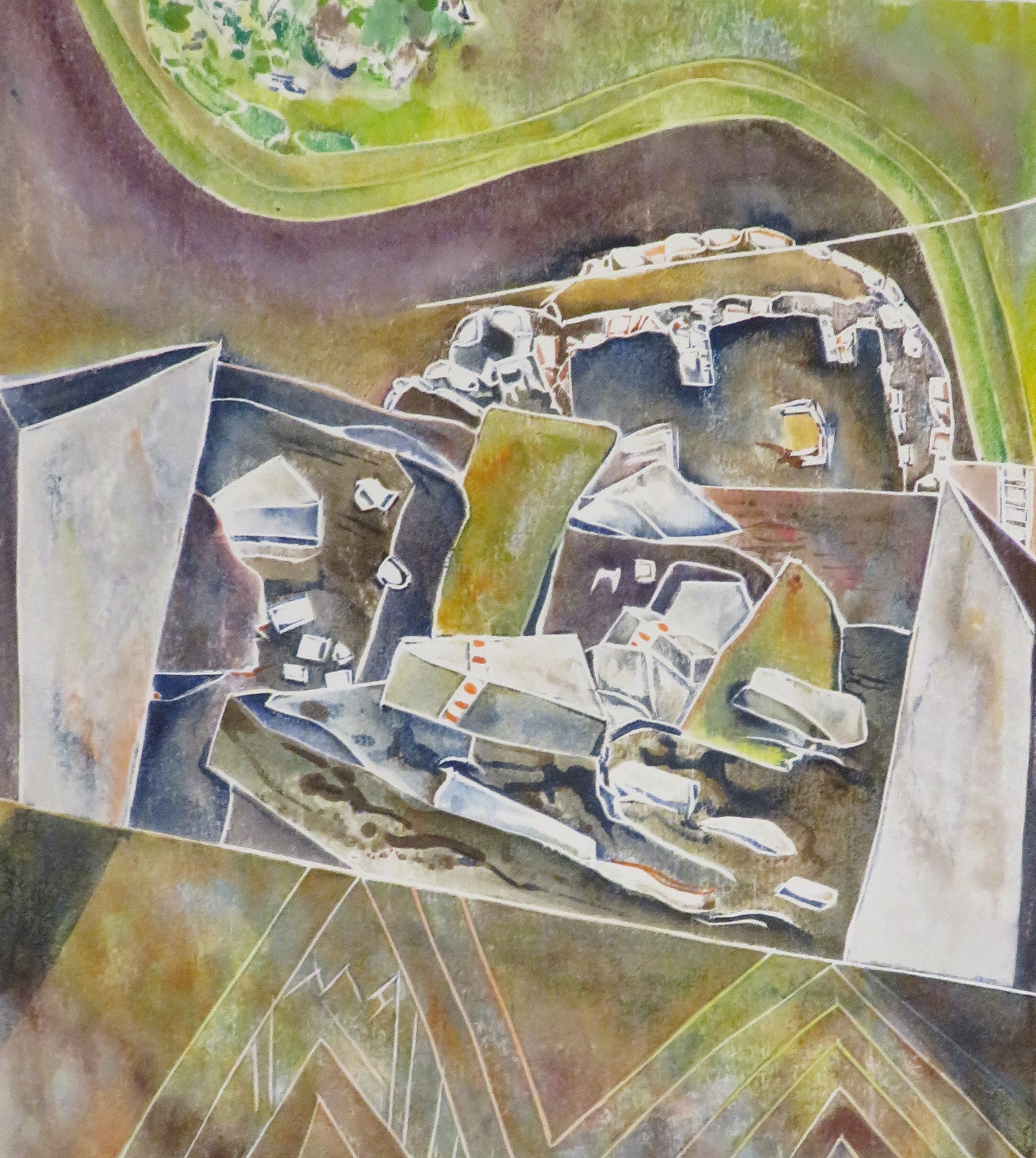 This is a watercolour whiteline woodcut, The Orkney Woodcut, a variation of the Provincetown print. It focuses on a curve of stones outside of Structure 1. The puddle just drew me in.