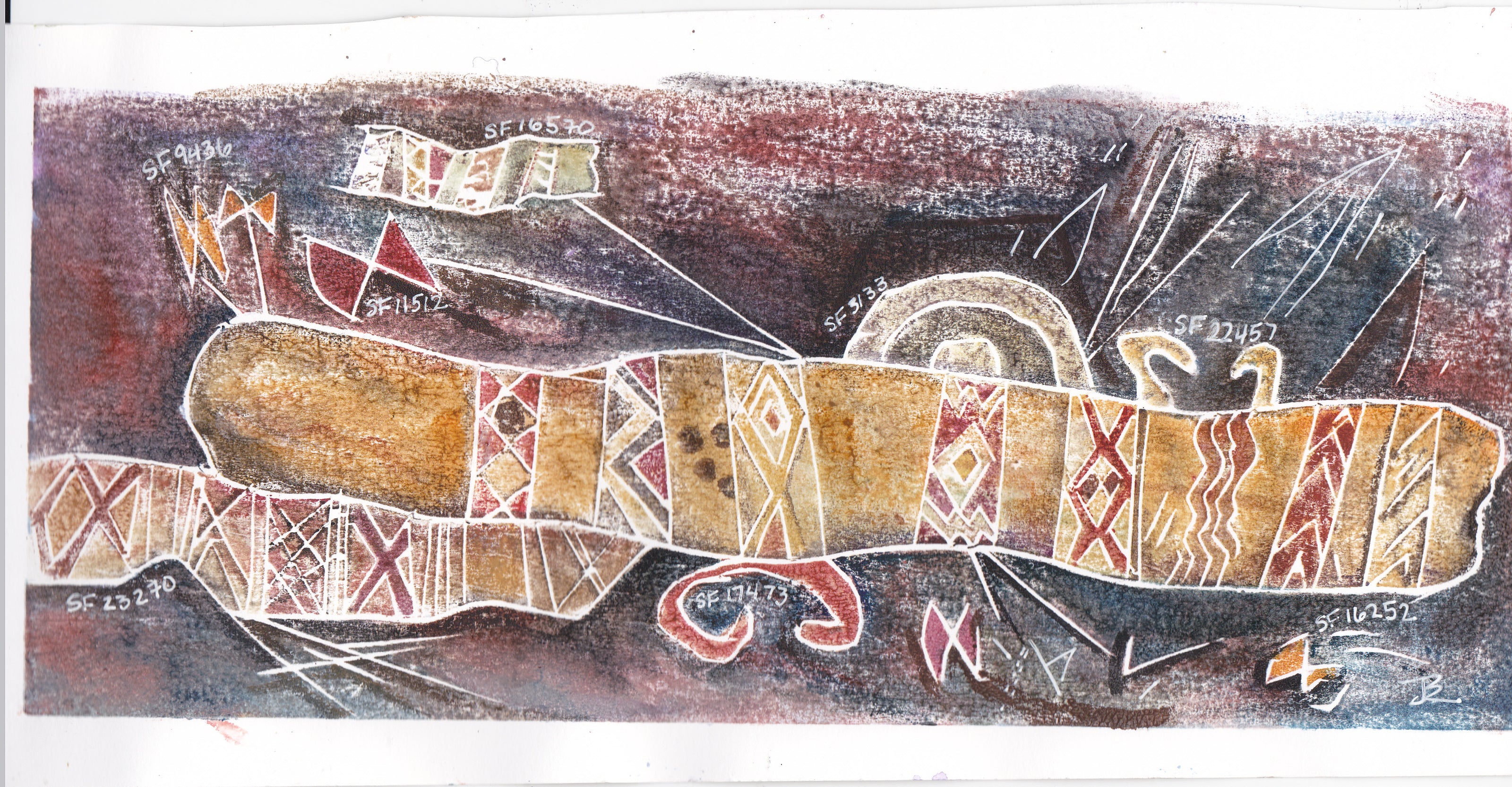 This is a watercolour whiteline woodcut, The Orkney Woodcut, a variation of the Provincetown print. I have purposely mixed point of view from an overhead to a head on. The two stones flanking the middle are the shapes of those actually marking an entrance to Structure 12. The middle is a piece of wall and top and bottom are the shapes of the earth above. I have added some of the actual marks from a key stone that is a huge triangular block marked with patterns of diamonds and triangles. Why?