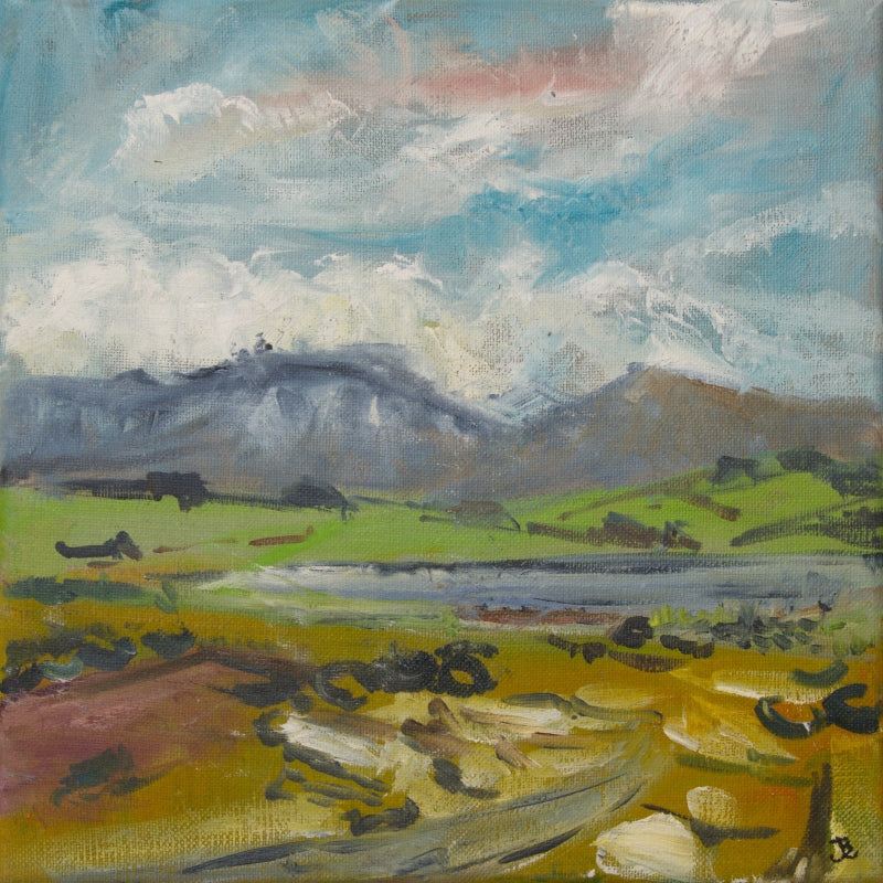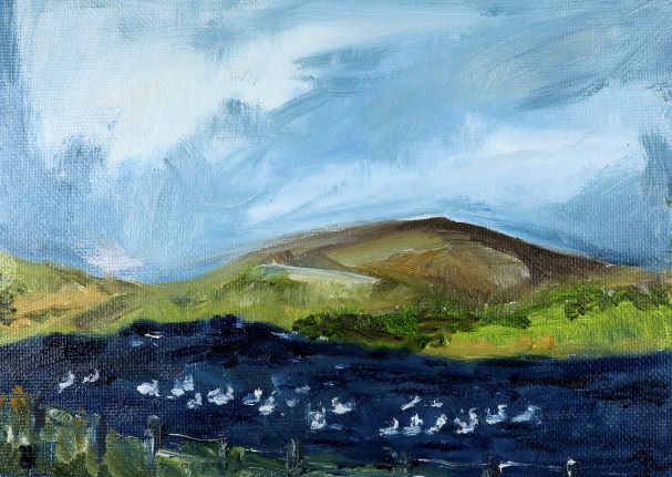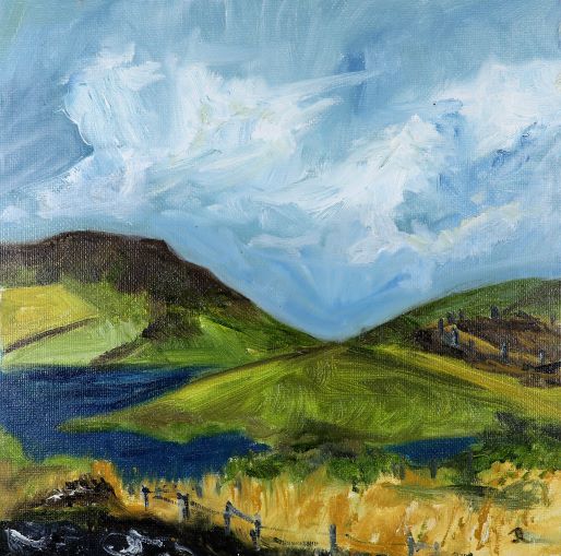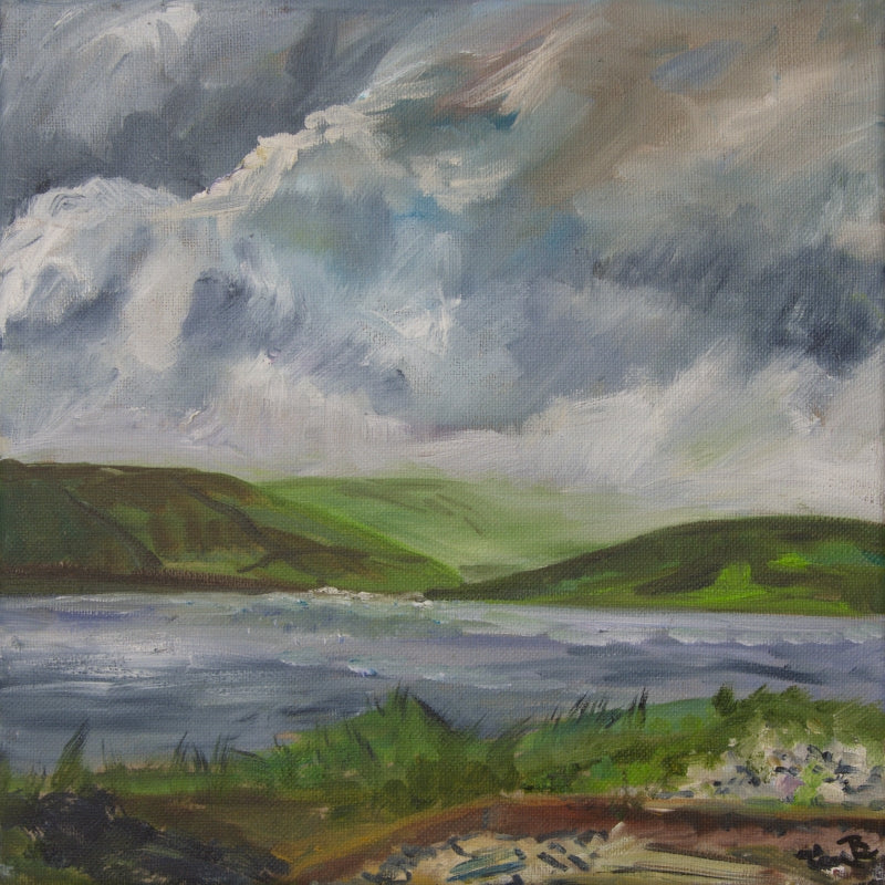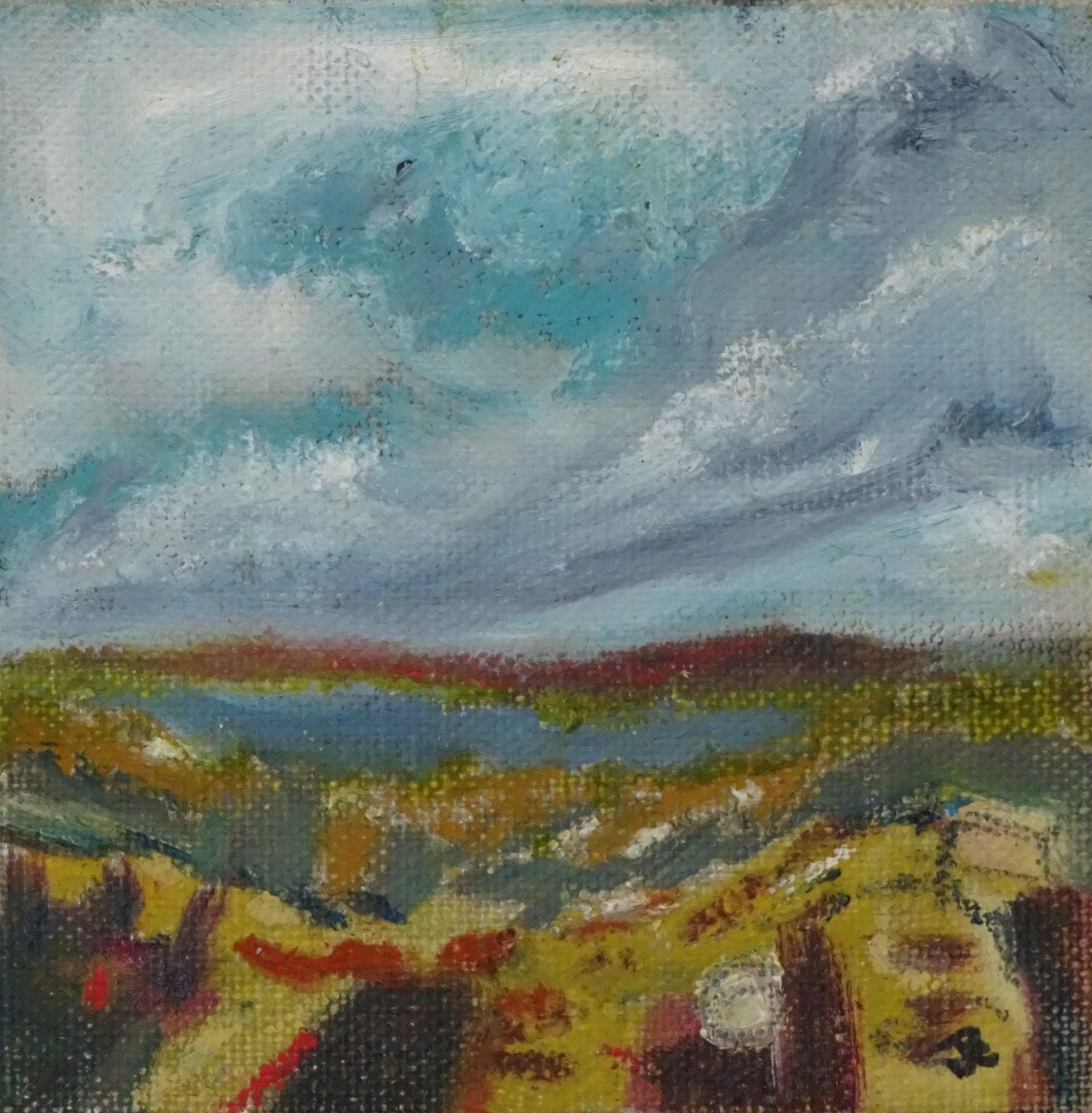 The clouds were changing so swiftly and the water was so blue, saphire blue, that I rushed to catch it all. Using a small canvas panel helps the speed. These are the two standing stones in the front garden of Lochview, the house, the central research place on the site. The diggers and myself, drive up past these two everyday to park our cars. We treat them all too casually.