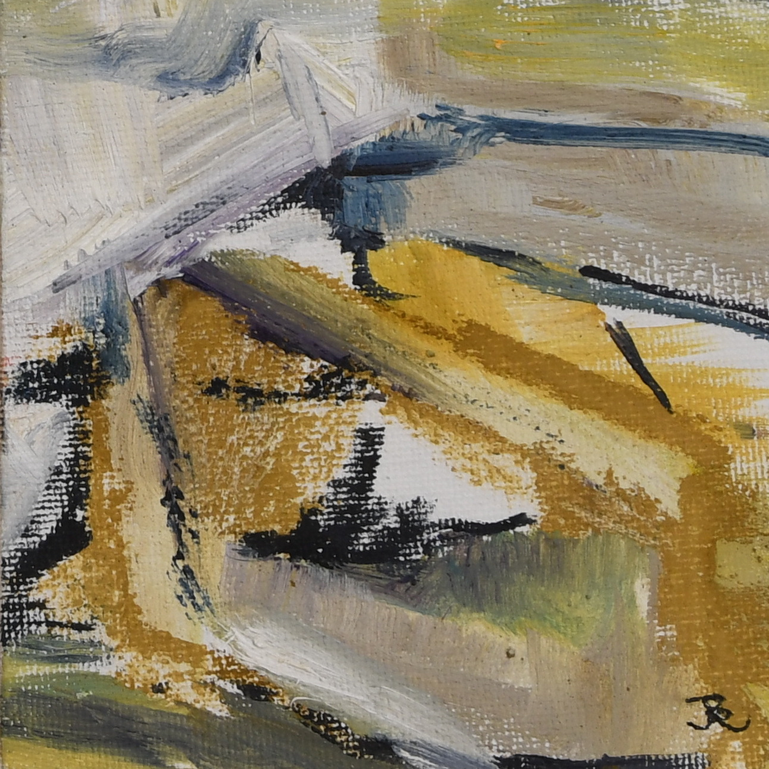 Original oil on canvas panel. Framed and mounted in white, under glass. Finished size 10 x 10 in