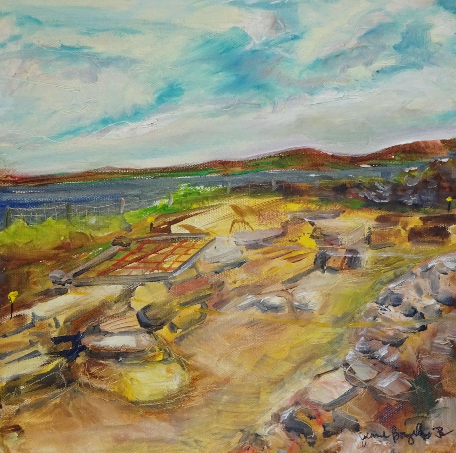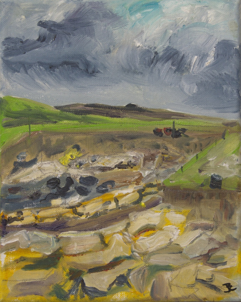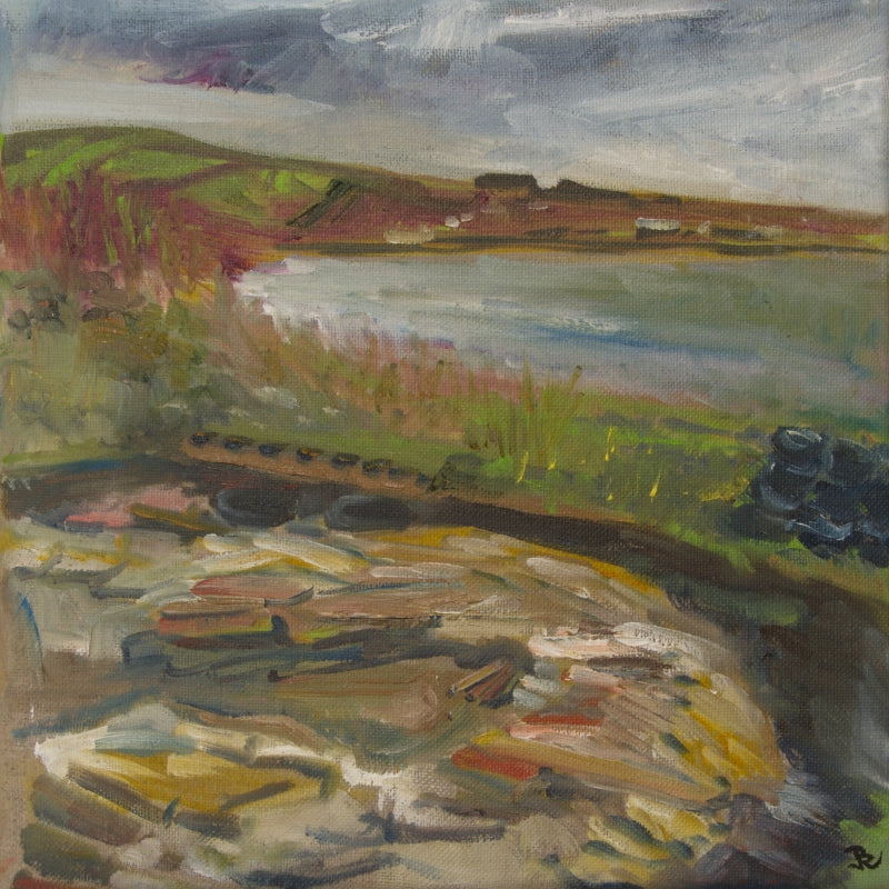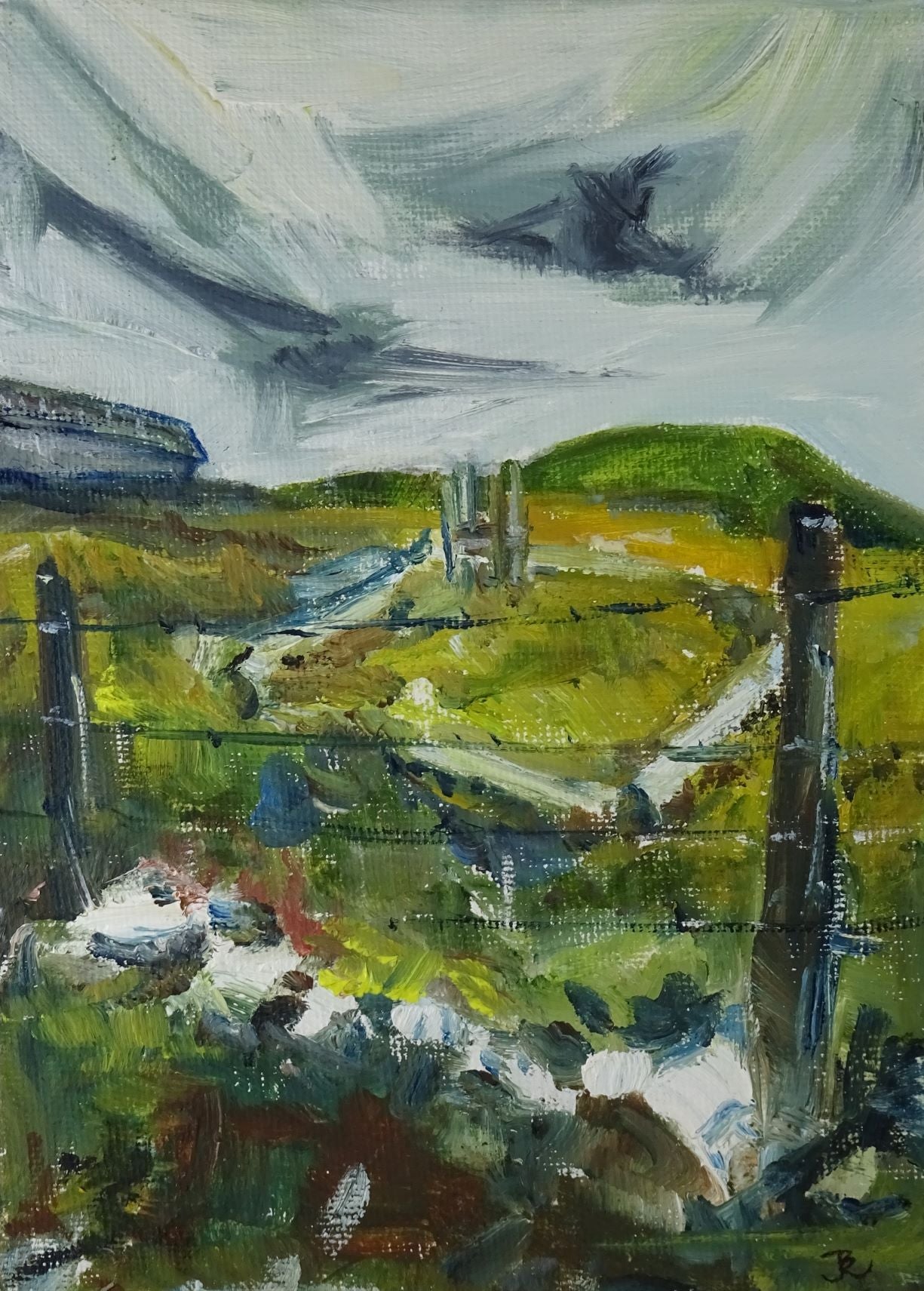 The wind was blowing and the rain was streaming down and there was a well orchestrated sharing of help. Each person grabbed a bit of the huge plastic and like a roundabout, they pulled and stretched it across the yawning trench. I grabbed a canvas panel and whipped the paint on, rather uncharacteristic for me, I added the blur of the moving shapes. The Ring of Brodgar was barely visible and the Brodgar farmhouse was reaching out with its attached sunroom. I like to think I caught the energy of the moment and the grey of the weather.