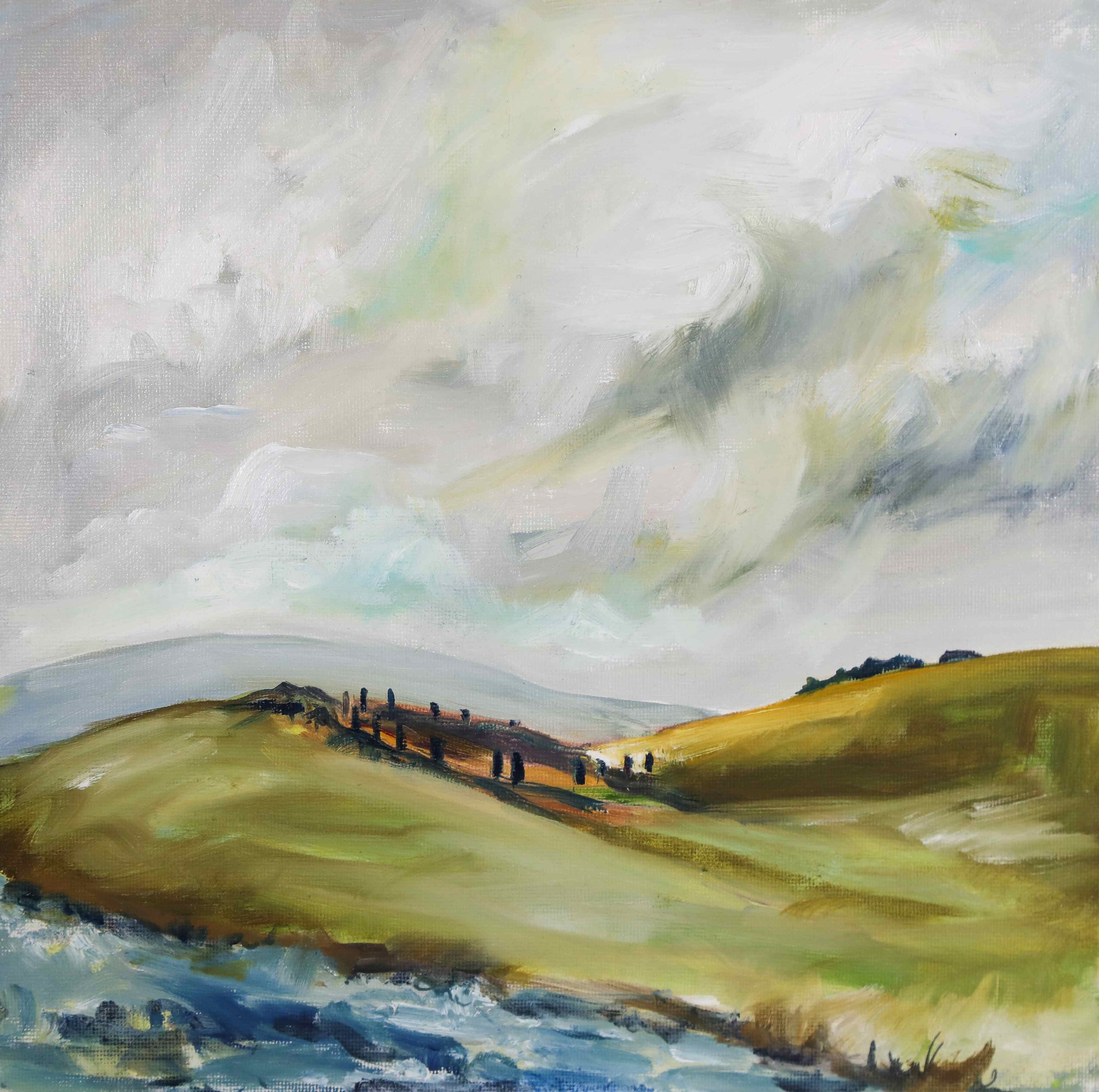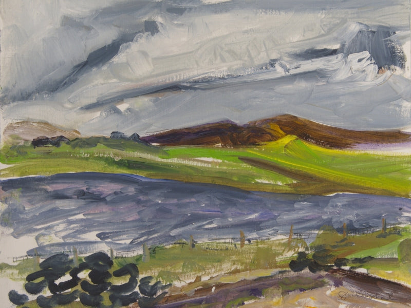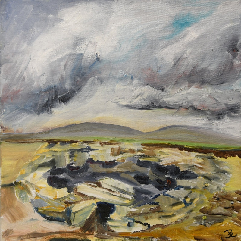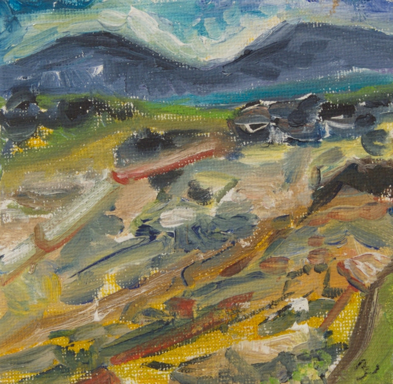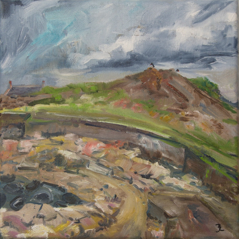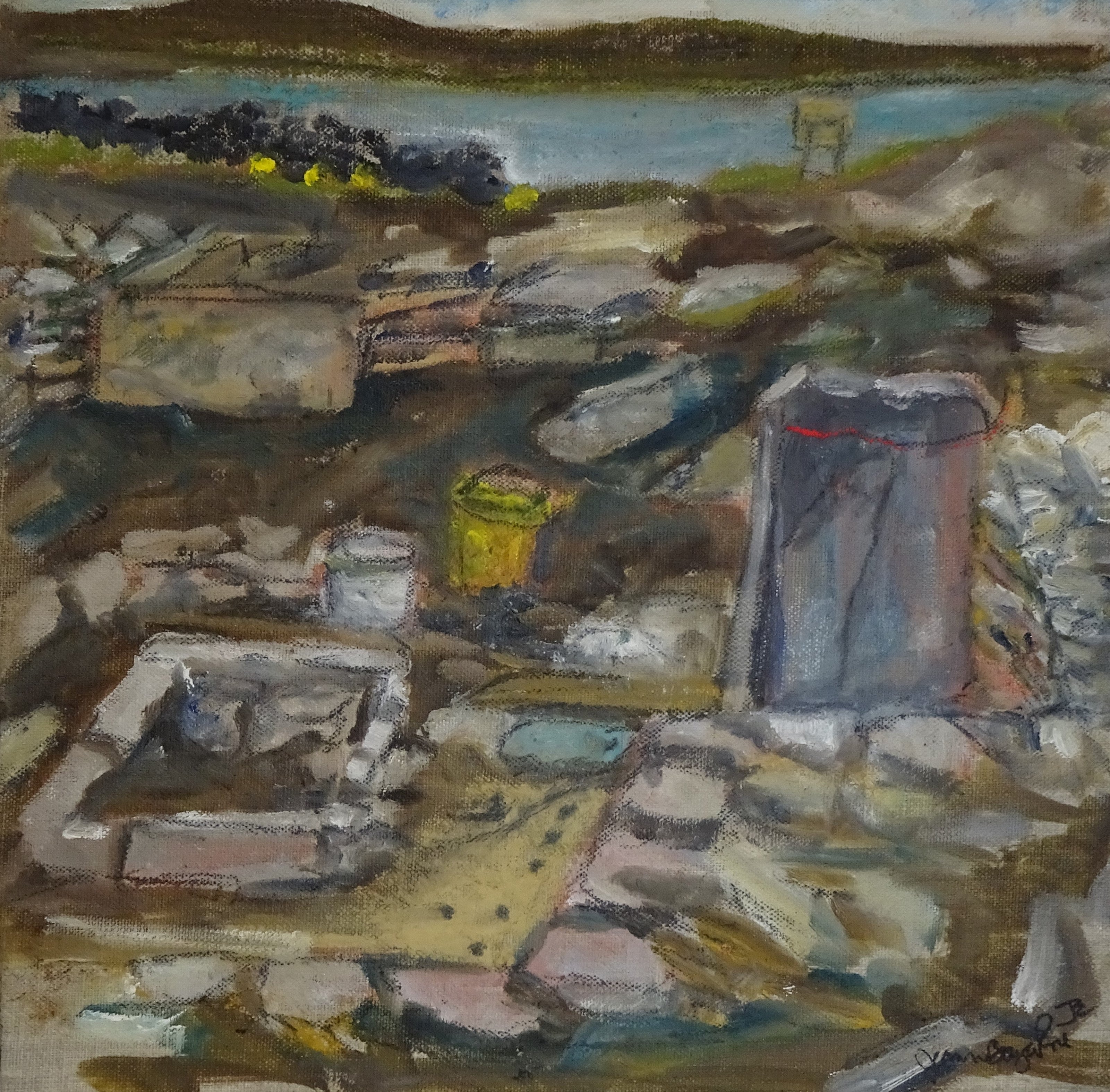The wind was blowing and the rain was streaming down and there was a well orchestrated sharing of help. Each person grabbed a bit of the huge plastic and like a roundabout, they pulled and stretched it across the yawning trench. I grabbed a canvas panel and whipped the paint on, rather uncharacteristic for me, I added the blur of the moving shapes. The Ring of Brodgar was barely visible and the Brodgar farmhouse was reaching out with its attached sunroom. I like to think I caught the energy of the moment and the grey of the weather.