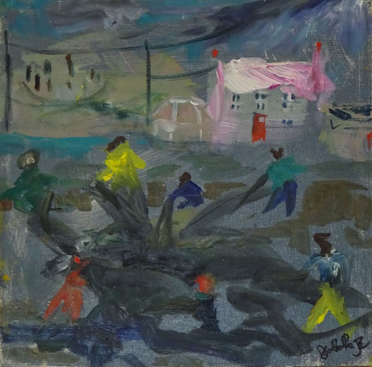 started working. The colours of their clothes shone so bright and their hair was blowing in all colours.Original oil on natural canvas 8 x10 20 x 26 cm FRAMED in black finished size 9 x10 22 x 28 cm