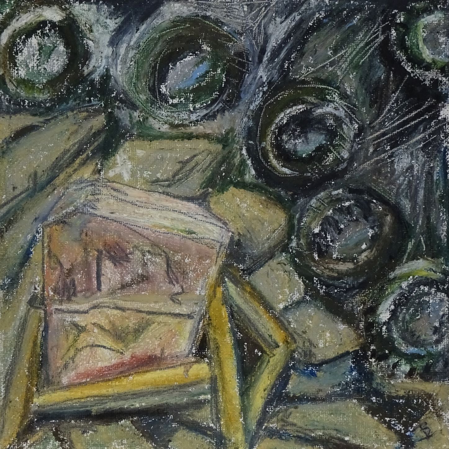 One of 2 INSIDE STRUCTURE 10 original oil on canvas panel 4 x 4in. Mounted and framed under glass. Finished size 16 x 11 in