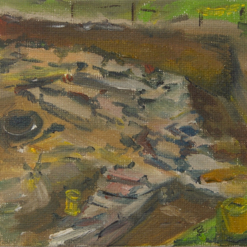 This year I prepared my canvases with a surface of gesso mixed with dirt from the spoil heap of Trench P. This was an interesting and possible habit forming condition as the oil paints were quickly sucked into the matt earthy surface and dried more quickly.